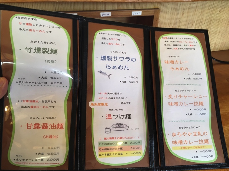 この高浜のほか、刈谷と東浦にも系列の店舗があり、竹燻製麺などの基本的なメニューは一緒ですが、店によって提供されているメニューやや違います。