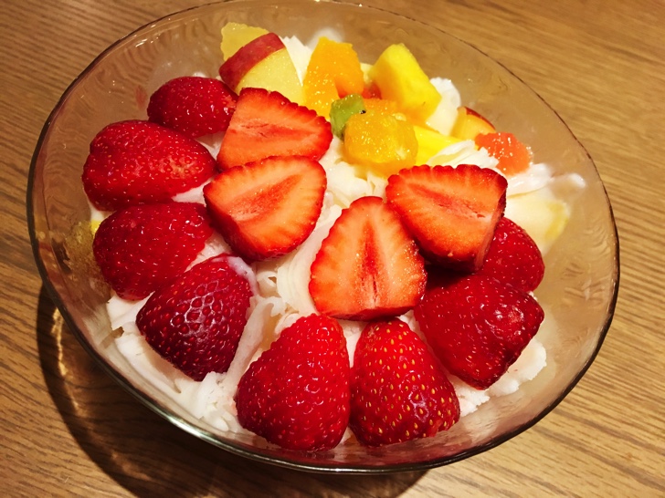 ガラスのボール皿いっぱいにふわふわのかき氷が盛られて出てきます。イチゴだけでなく、オレンジ、グレープフルーツ、パイナップル、キウイフルーツ、リンゴなどのフルーツがたっぷり入っています。