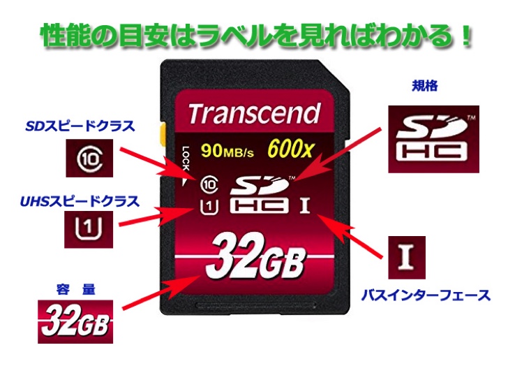ローマ数字の「Ⅰ」、「Ⅱ」、「Ⅲ」で表記されているのがバススピード。「Ⅰ」は最大104MB/秒、「Ⅱ」は最大312MB/秒、「Ⅲ」は最大624MB/秒、表記がないものは最大25MB/秒しかありませんので安くても買ってはいけません。一般的なデジカメで使うなら「Ⅰ」以上あれば十分。