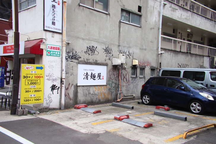 なお、車で行く場合、すぐ近くのタイムズは駐車料金が土・日15分300円とかなり高いのですが、5分ほど歩いた清麺屋の隣にある駐車場は土・日30分200円なので、こちらをオススメします。