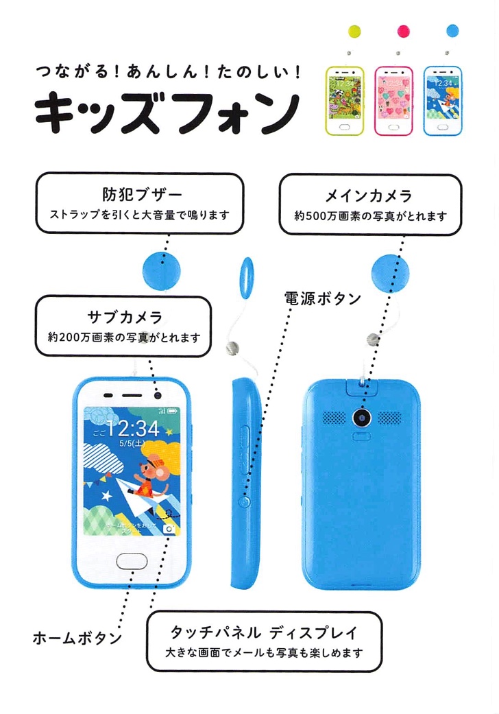4月に新機種が発売されたばかりのため、タッチパネルはもちろん、500万画素のメインカメラ、200万画素のサブカメラ搭載など3社の中では一番機能が充実していますが、子どもに持たせるにはオーバースペックのような気がします。その分、月額利用料も上がり、3社の中では一番高い価格となっています。