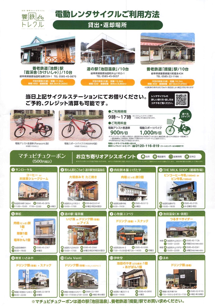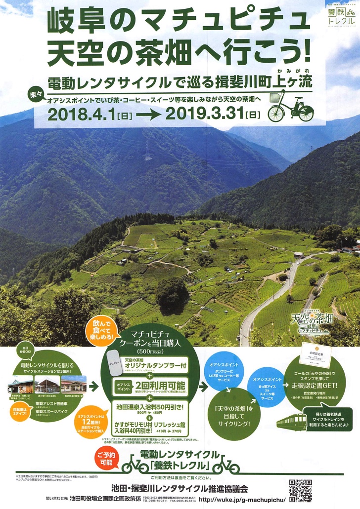 筆者は自家用車で訪れましたが、自転車で登っている方々に遭遇しました。本格的なロードバイクの方から、レンタルの電動自転車の方までおられました。電動自転車は養老鉄道の「池野」もしくは「揖斐」の駅前、道の駅「池田温泉」の3箇所で借りられます。勾配は相当きついので、足に自信がある方のみどうぞ。行きはたいへんですが、帰り道は超爽快なのは間違いありません。次回は車に自転車を積んで、下り坂だけ自転車で走ろうと思案中。