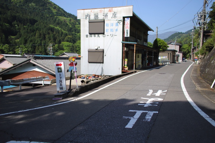 バス停の看板と道路の左側にある上ケ流茶園の看板が目印。