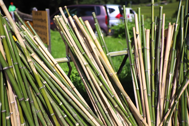 募金箱の横には竹でできた杖が置いてあり、こちらも無料で使うことができます。展望台までの道のりは急なので、必ず借りましょう。長さ、太さが色々あるので、自分の身体にあったサイズを選んでください。