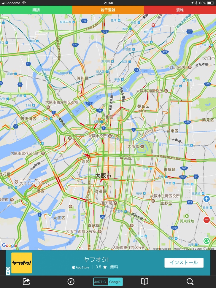 Googlマップに切り借りると、詳細な渋滞情報を見ることができるので、かなり役立つはず。画面をスクロールして行き先ルートを表示したり、拡大縮小できます。