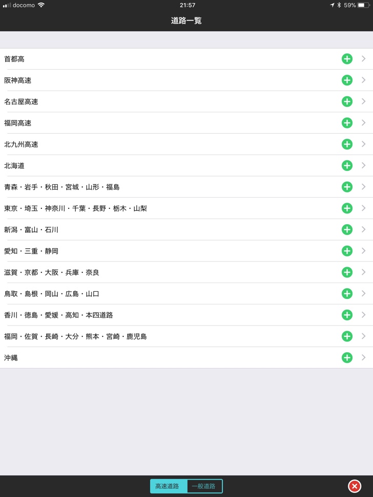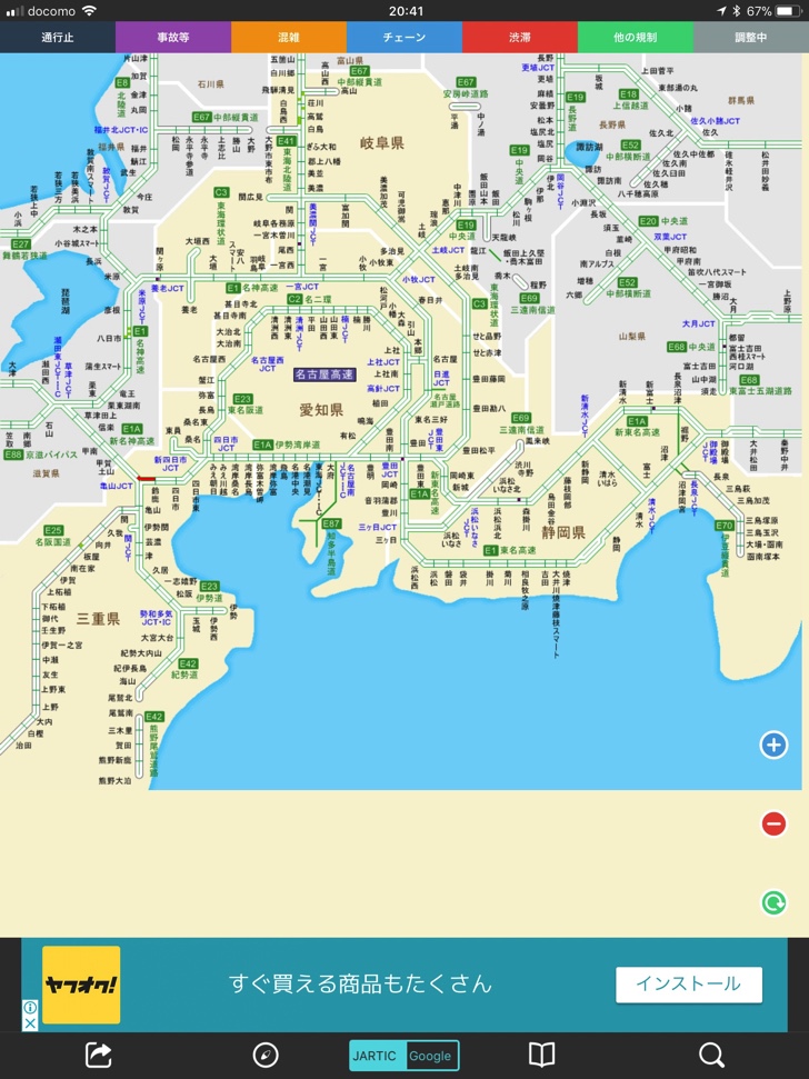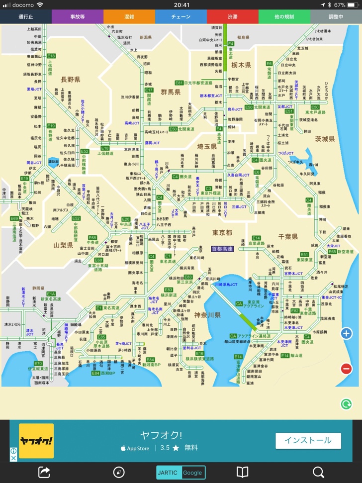 地図の拡大縮小も自由自在。JARTICの画面から、右下の検索画面をタップすると高速道路と一般道路の一覧が出てるので、観たい地域を選べばOK。首都高、阪神高速、名古屋高速はもちろん、地方の高速道路も網羅しています。
