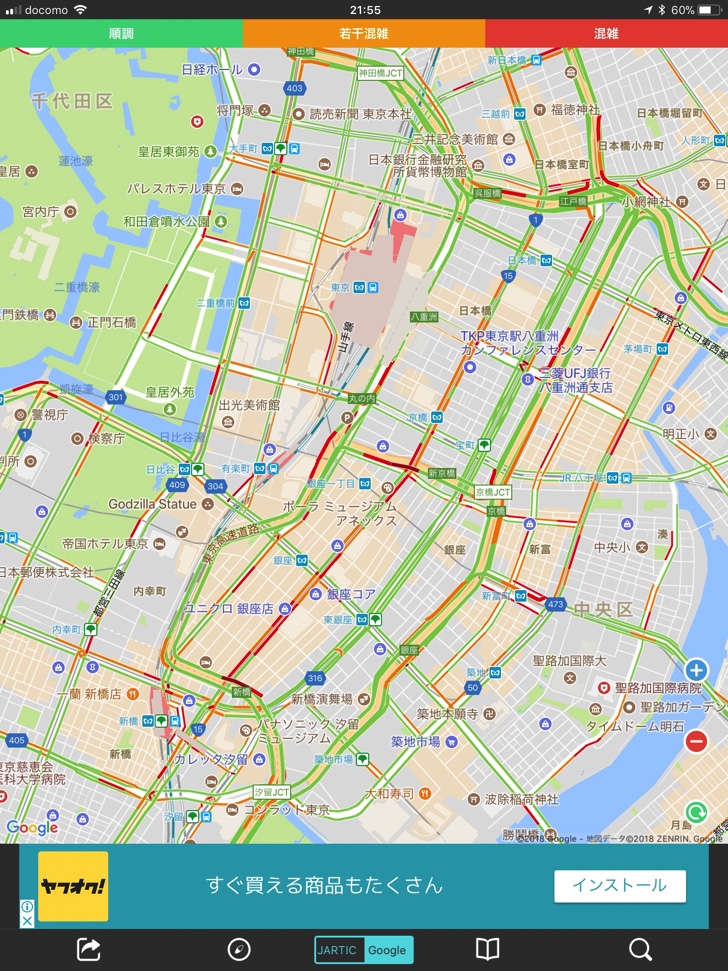 渋滞情報は東京首都圏だけではなく、全国の高速道路と主要一般道路をほぼ網羅しています。渋滞ソースは公益財団法人日本道路交通情報センター(JARTIC)の提供する渋滞などの道路情報とGoogleマップの渋滞情報を素早く切り替えられます。