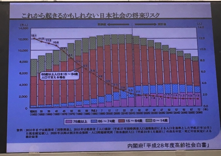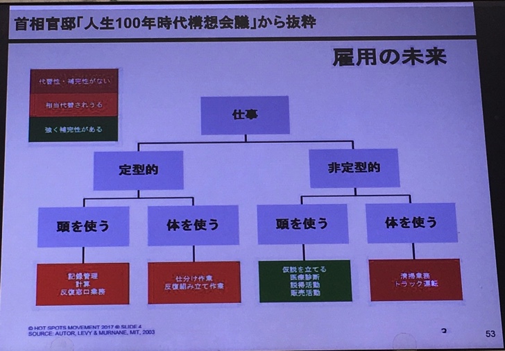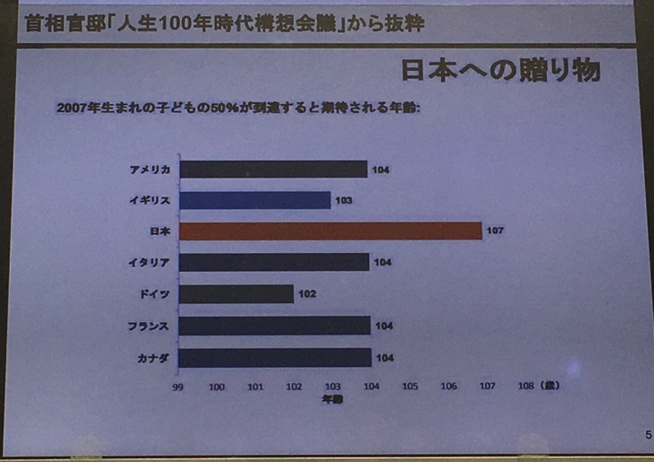 リンダグラットンのライフシフトに書かれているような内容。2007年に生まれた人の半分は107歳まで生きると言われている。今後、就労を促す制度設計変更が行われる。年配の人をより長く働かせるしか年金問題と人手不足を解消する方法はない。年配の人が働く理由の第1位はお金の問題、第2位は規則正しい生活をするため。長生きしても健康でなければ意味がない。健康に過ごすためには規則正しい生活が一番。