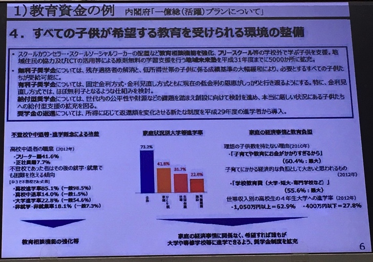 すべての子供が希望する教育を受けられる環境の整備が始まっている。奨学金制度が充実してきているが申請しないと受けられないため情報格差が出てきている。こういった情報を知っているか知らないかで大きく違ってくる。