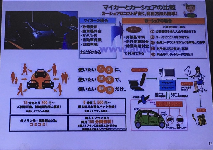カーシェアを使えば経費は大幅に下がる。講師の前田氏はマイカーを持たずカーシェアリングサービスを利用して、大幅に経費が下げている。