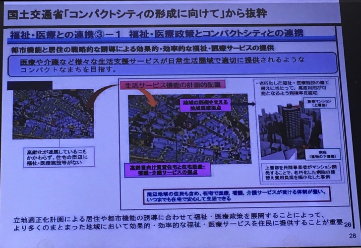 人が増える地区にしか国は力を入れない時代に突入している。在宅医療の需要が高まっており2025年までにコンパクトシティへ変えていくことが決まっている。すでに平成26年から立地適正化計画が始まっている。