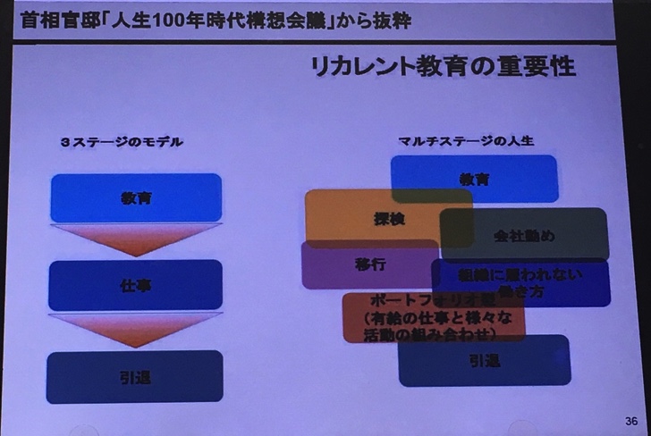 今までの「教育」「仕事」「引退」という3ステージのモデルから「教育」の後は「会社勤め」「旅行・探検」「組織に雇われない働き方」「有給の仕事とボランティア活動などの組み合わせ」などマルチステージの人生へ発想を変えていかなければならない。