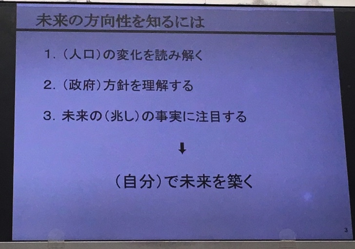 株価や為替の予測は難しいが、人口の変化は確実に予測できる。未来の兆しを他の人より早く知ることが大切。それを知った上で活用して未来を築く。