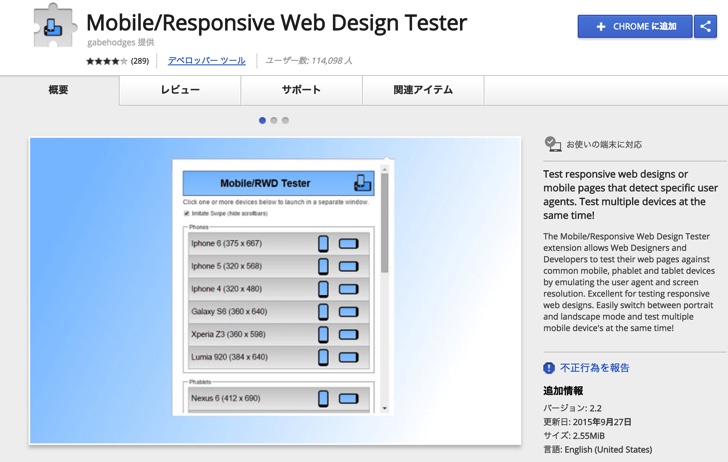 今回のWeb解析講座で講師のK先生がChromeを立ち上げてページを見ていた時に使っていたのが今回紹介する「Mobile/Responsive Web Design Tester」というChromeのプラグイン。これを使えば、iPhone、Xperia、GalaxyなどのスマホやiPad、Kindle Fireなどのタブレットまでそれぞれの解像度でプレビューできます。