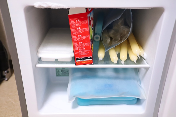 庫内はまずまずの広さがあり、保冷剤、いざという時の氷枕、製氷皿、アイスクリームなどを入れてもまだ余裕があります。やはり、夏場はキッチンの冷蔵冷凍庫+これぐらいの冷凍庫があるとゆったり過ごせます。
