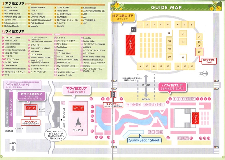 初日の25日(金)はオアシス21のオアフ島エリアだけの展開ですが、26日(土)、27日(日)は名古屋テレビ塔下のマウイ島エリア、セントラルパーク内パークスエア・セントラルギャラリーのカウアイ島エリア、久屋大通公園の中にあるもちの木広場、さかえ川のハワイ島エリアでもステージやブースが設けられ、面積が一気に広がり、ハワイアンフードなどを楽しむことができます。