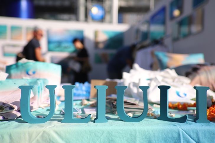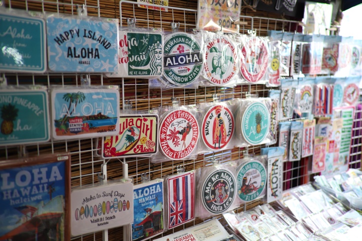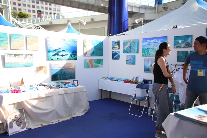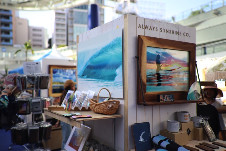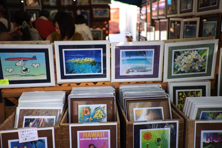 写真やポスターのブースがあり、美しいハワイの風景が切り取られています。