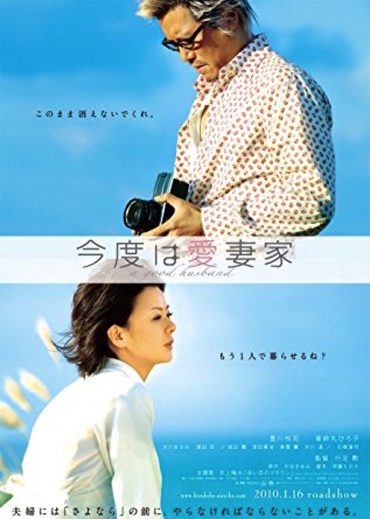 47本目の映画はAmazonプライムビデオで観た「今度は愛妻家」。カメラマンのぐうたら亭主・俊介役に豊川悦司、そんな夫に文句を言いながら世話を焼く健康マニアの妻・さくら役に薬師丸ひろ子、妻の父親でオカマ役に石橋蓮司、俊介の事務所に所属する若手カメラマン役に濱田岳、芸能事務所に所属する若手タレント役に水川あさみ。登場人物はほぼ、この5人のみ。その他、ちらっと井川遥、城田優、津田寛治、奥貫薫などがでていますが、本当にごくわずか。