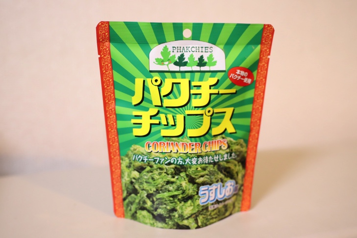 先日、某リカーショップでおつまみを物色していたら棚の正面に吊ってあって思わず手にとったのが「パクチーチップス」。派手なデザインに「パクチーファンの方、大変お待たせしました」と魅惑的なキャッチコピーが。「本物のパクチー使用」と書いてあり、パッケージにはパクチーをそのまま素揚げした写真が載っています。