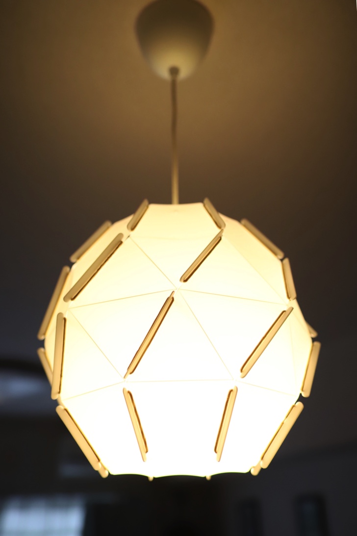 ほのかな明かりがおしゃれなペンダントランプ。リビングのランプが13年以上経ち、古くなったので買い替えました。折り畳まれているので持ち帰りの際はコンパクトな箱に入っています。組み立てはプラスチックの板をゴムバンドで留めていけば簡単にできあがります。