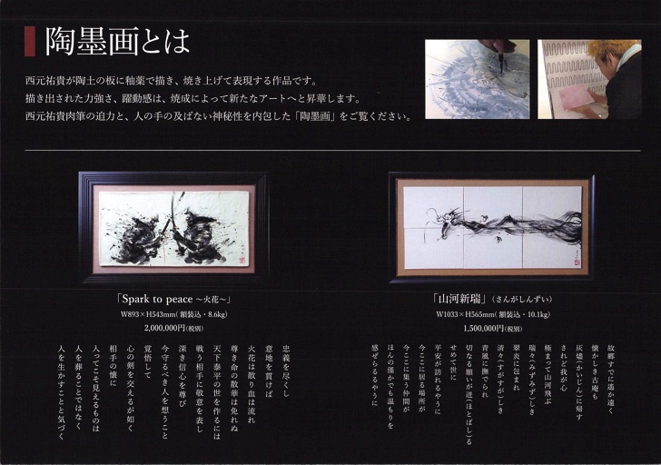 西元祐貴が陶土の板に釉薬で描き、焼き上げて表現する作品。 描き出された力強さ、躍動感は、焼成によって新たなアートへと昇華します。 西元祐貴肉筆の迫力と、人の手の及ばない神秘性を内包した「陶墨画」をご覧ください。西元祐貴 Profile