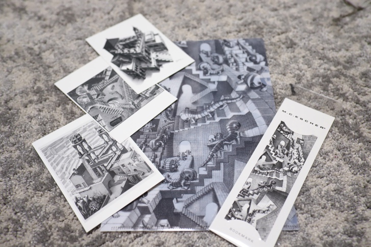 残念ながら会場内は撮影禁止のため写真はありませんが、エッシャーを代表する錯視を利用しただまし絵をはじめ、「科学」「聖書」「風景」「人物」「広告」「技法」「反射」をテーマにした絵が約150展ほど飾られていました。