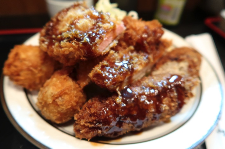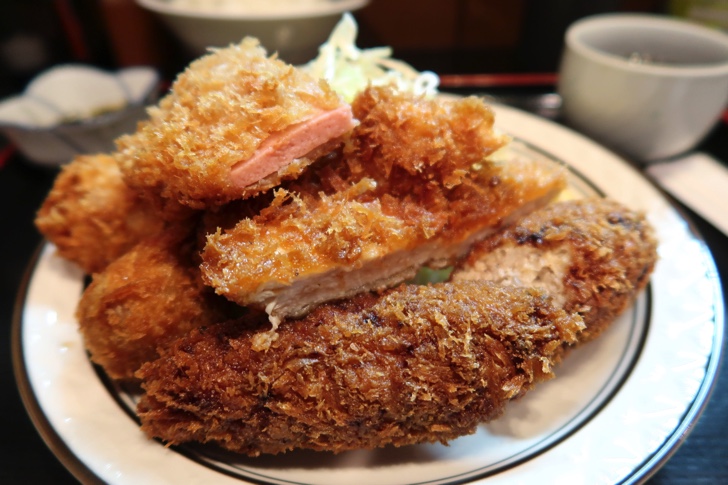 ミックスフライ定食はメンチカツ、チキンカツ、ハムカツ、ポテトコロッケの4種類で、ご飯と味噌汁、漬物がついてきます。ソース、もしくは醤油をかけていただきます。ざっと見た感じではおそらく7〜8割ぐらいの方がこのミックスフライ定食を頼んでいます。