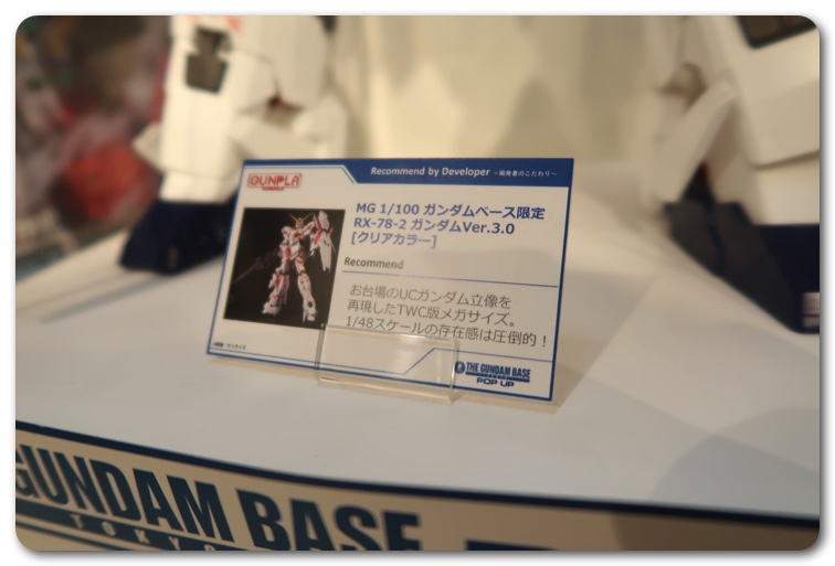 ガンダムベースオリジナルの新発売されたガンプラが展示されています。ここに展示してあるものは、すべて物販コーナーで販売しています。