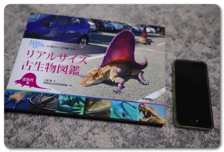 「リアルサイズ古生物図鑑」のリアルサイズを実感していただけるよう、iPhoneSEを横に並べてみました。