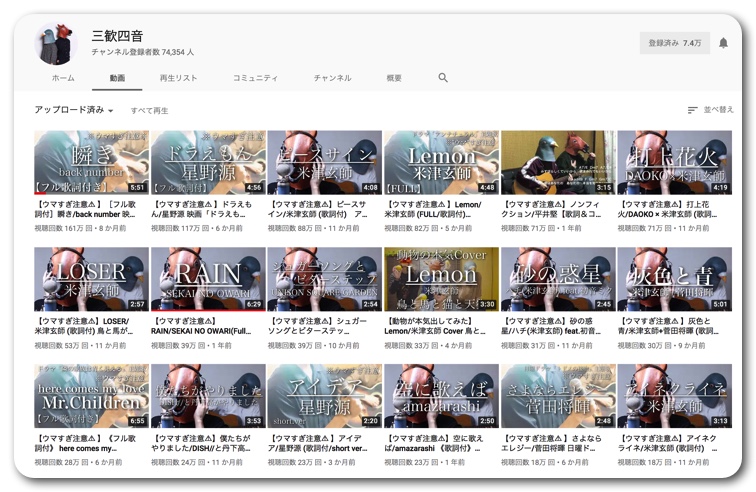 登録者数は7.4万人、一番再生回数の多いbacknumberの「瞬き」は161万回、その次の星野源の「ドラえもん」は117万回再生されており、それ以外も上位28本が10万回を越えています。
