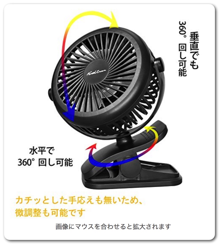 妻の要望は「簡単にUSBで使える」「充電できて扇風機だけで使える」「クリップでとめられる」というもの。これらの条件を満たしたのがこの「充電クリップ式 USB扇風機」。