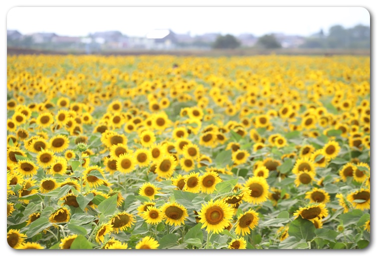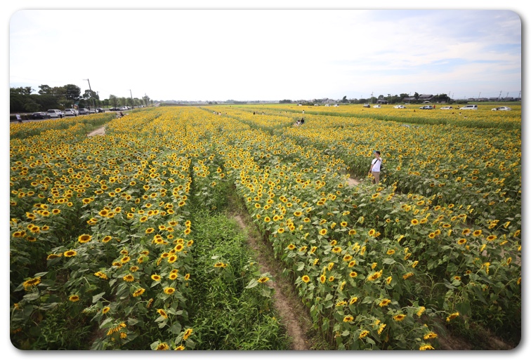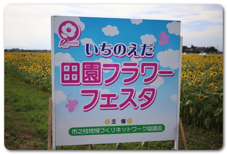 今までにも知多半島の観光農園花ひろばなど、いくつかのひまわり畑を見てきましたが、これほど大きなのは初めて。道路沿いから遥か彼方までひまわりが一面に広がっています。「いちのえだ田園フラワーフェスタ」という看板があり、調べてみたら2.9haの広大な休耕地に16万本のひまわりが咲いているとのこと。