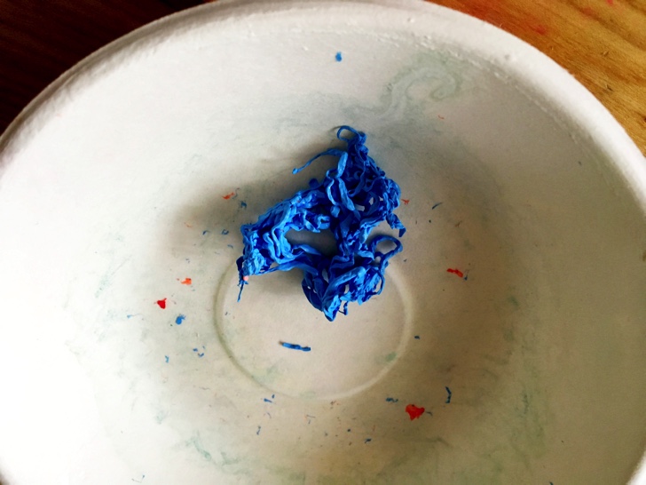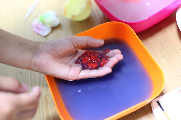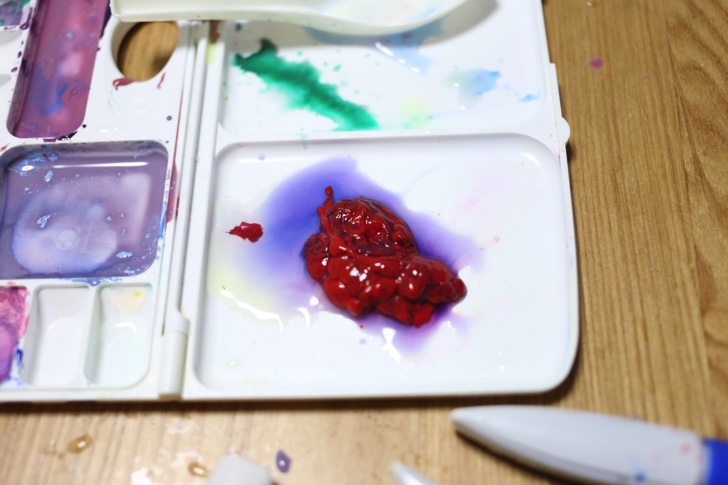 絵の具はよく混ぜてから塩化カルシウム水に入れないと膜が固まらず失敗します。かなりグロい感じになってしまいました。