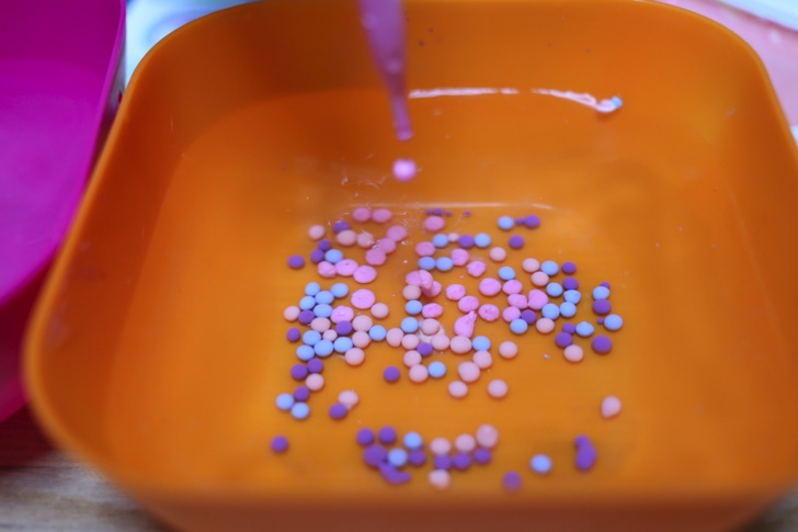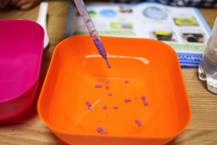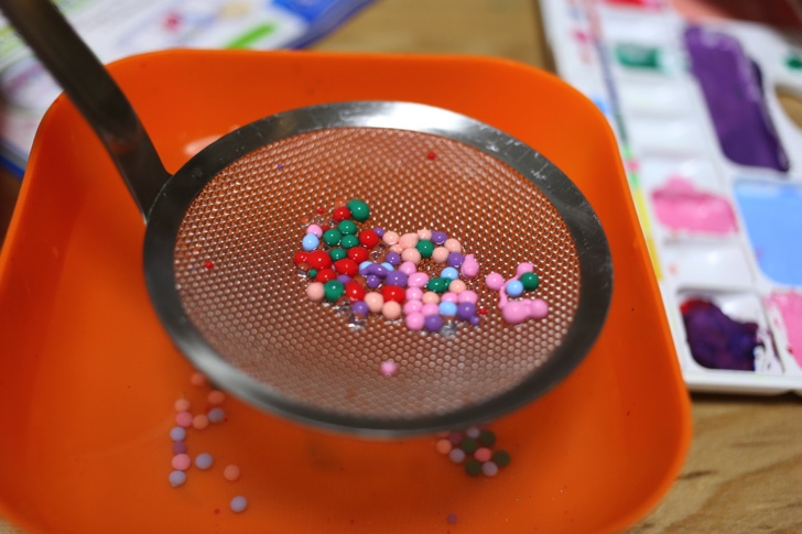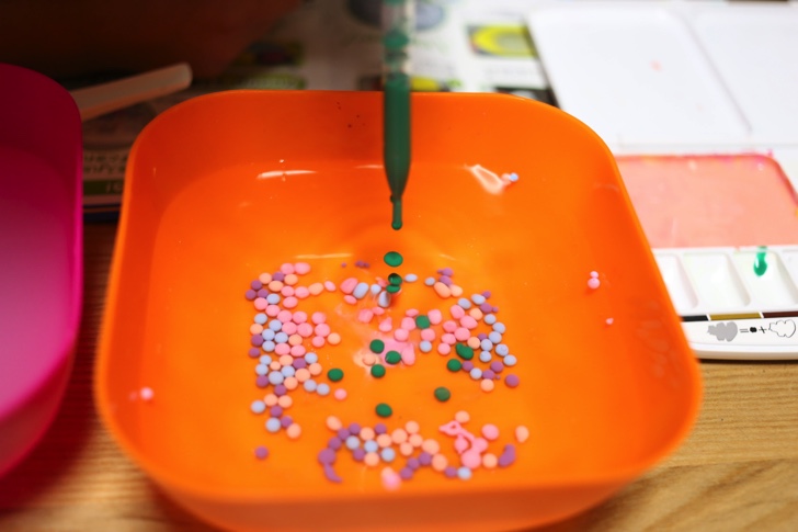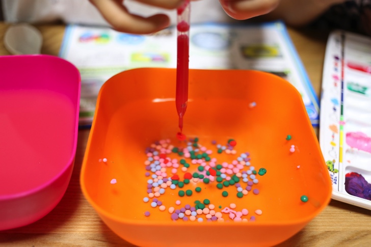アルギン酸ナトリウム水と絵の具を混ぜると色のついた「つかめる水」ができあがります。スポイトで垂らすと細かい粒状になります。