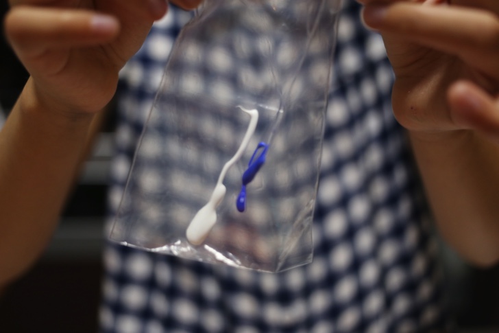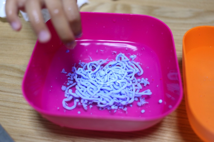 ビニール袋の端をほんの少し切って、そこから塩化カルシウム水に垂らすと麺のようになります。