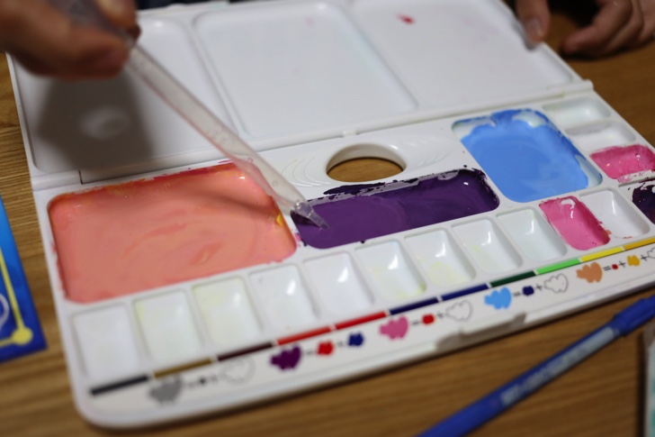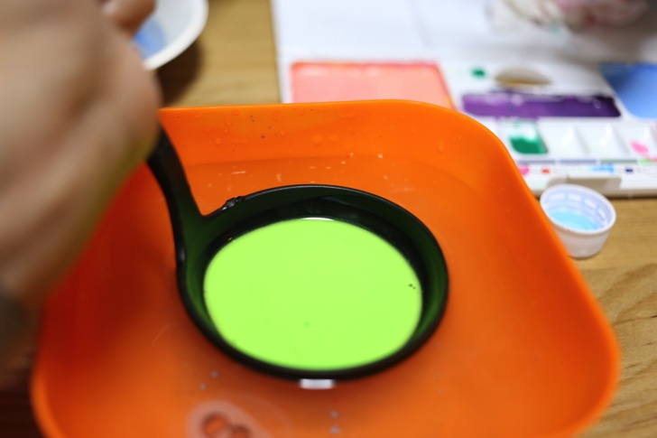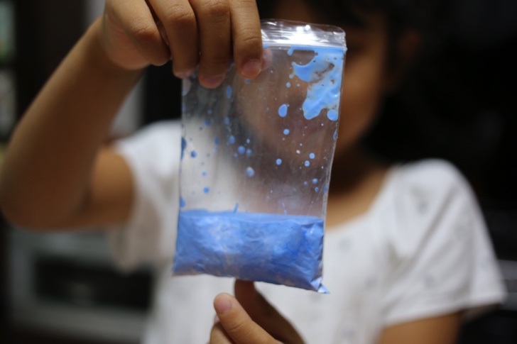 次はビニール袋に絵の具を入れて、ここにアルギン酸ナトリウム水を入れよく混ぜます。