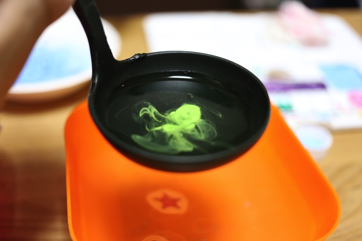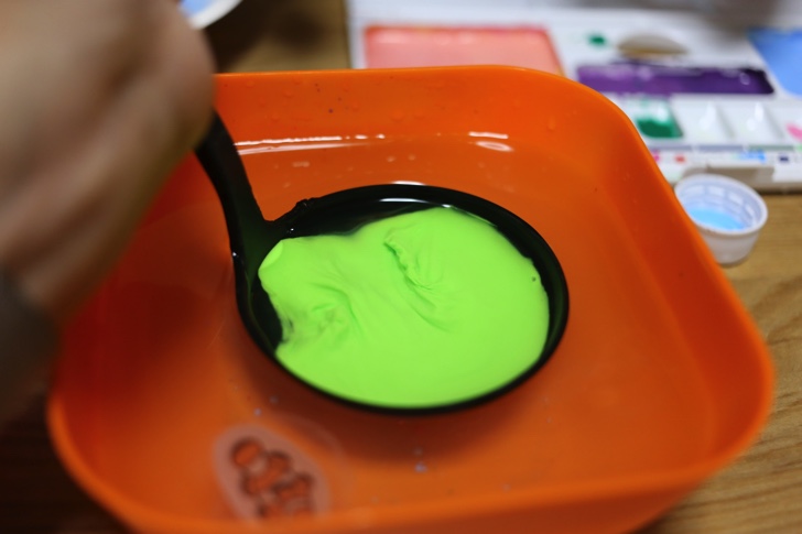 お玉にアルギン酸ナトリウム水と絵の具を入れてよくかき混ぜ、塩化カルシウム水の中で上手にまとめるとドラクエのスライムみたいになります。