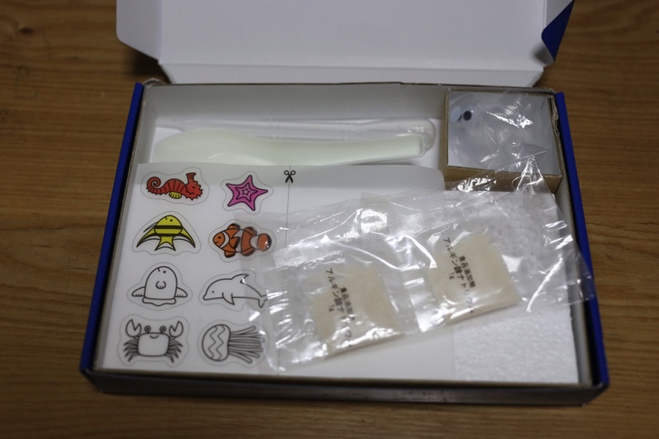 箱の中には取扱説明書、アルギン酸ナトリウム(2袋)、塩化カルシウム(2袋)、レンゲ、スポイト、目玉(1組)、シートが入っています。