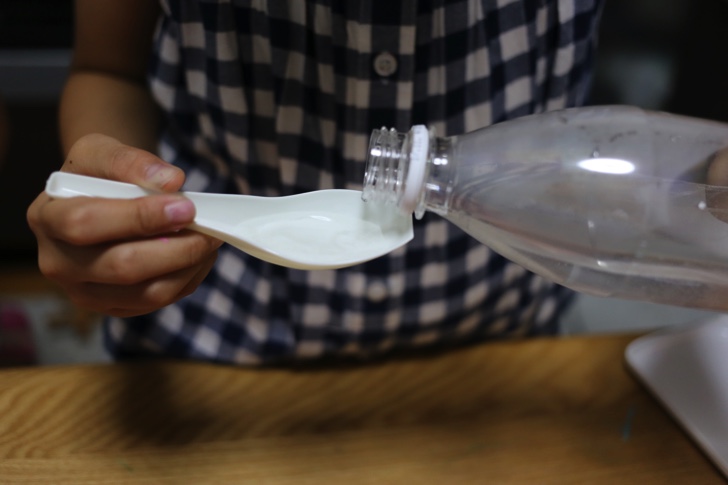 もうひとつのボウルに水を500ml入れます。ペットボトルに入ったアルギン酸ナトリウム水を付属のレンゲに入れます。