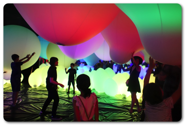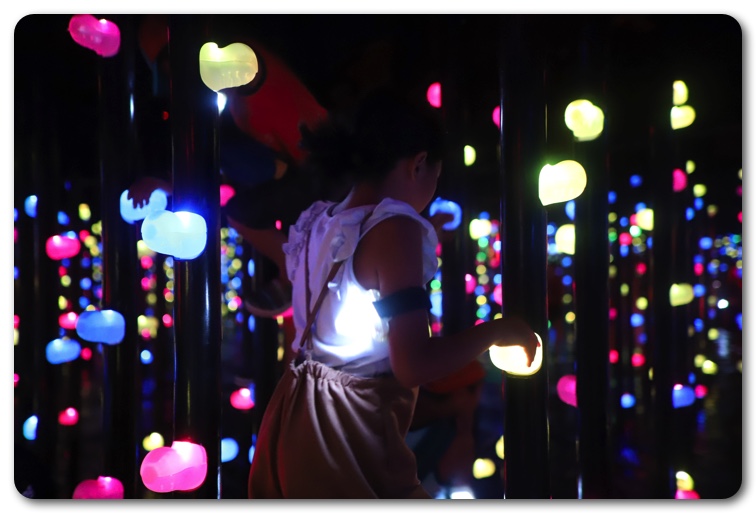 特に感動したのはムービングライト(動くスポットライト)が縦横無尽動いて、まるで光が生きているかのような演出が素晴らしい「靄(もや)の彫刻」という展示。どんどんパターンが変わる光景は本当に美しく、子どもを妻に任せてしばらく入り浸っていました。
