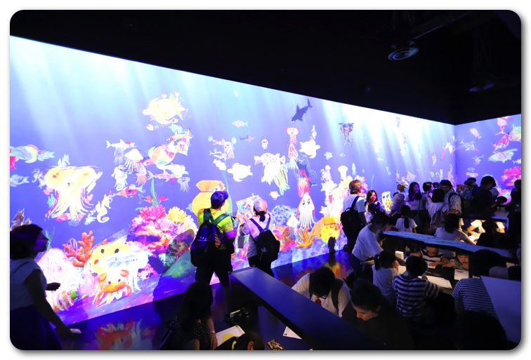 豊洲でもチームラボのイベントが開催されていますが、子どもと一緒に行くなら断然、お台場のチームラボボーダレスがおすすめ。小学生の我が娘たちは夢中になって遊んでいました。終わってから何が一番楽しかったか聞いたところ、「お絵かき水族館」とのこと。意外にも古いコンテンツが楽しかったようで、子どもたちにとっては最新のものが一番楽しいというわけではないということがわかりました。