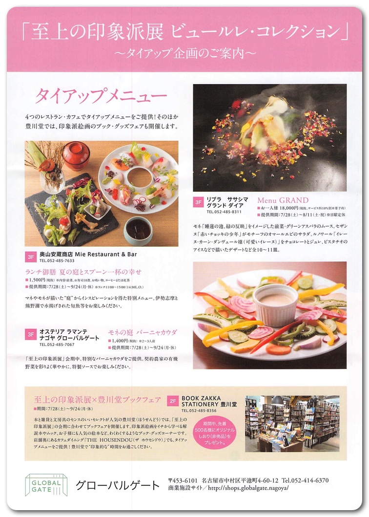 今回の展覧会とグローバルゲートのレストランがタイアップし、様々なメニューを提供しています。作品の余韻に浸りながら、食事するのもいいかもしれません。