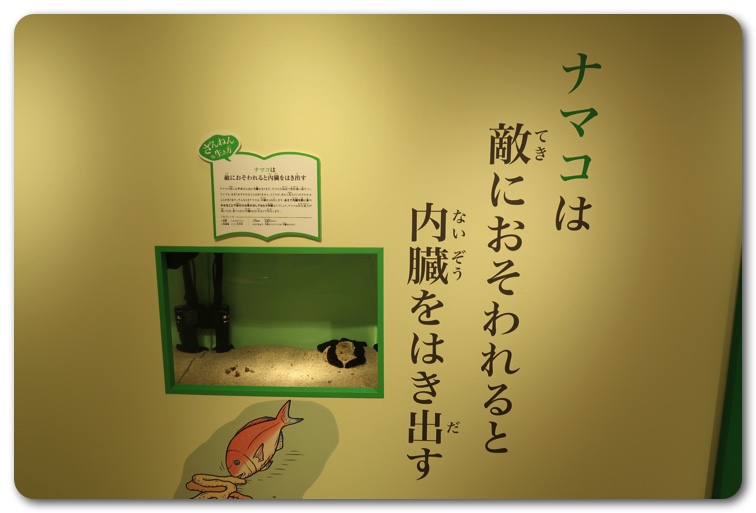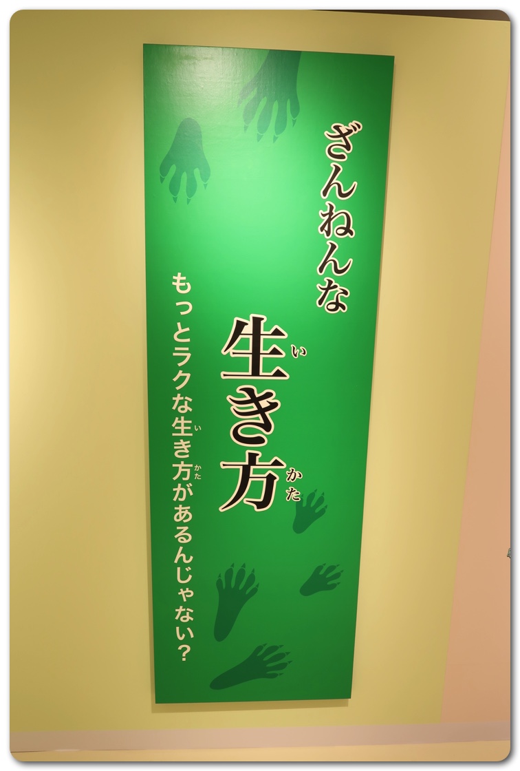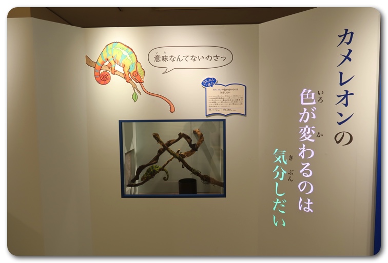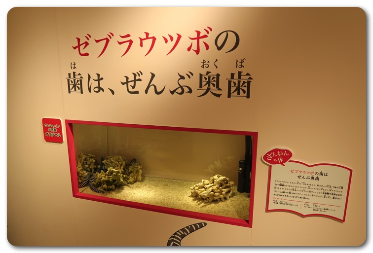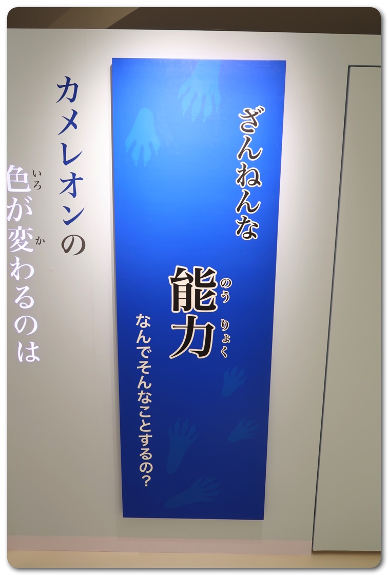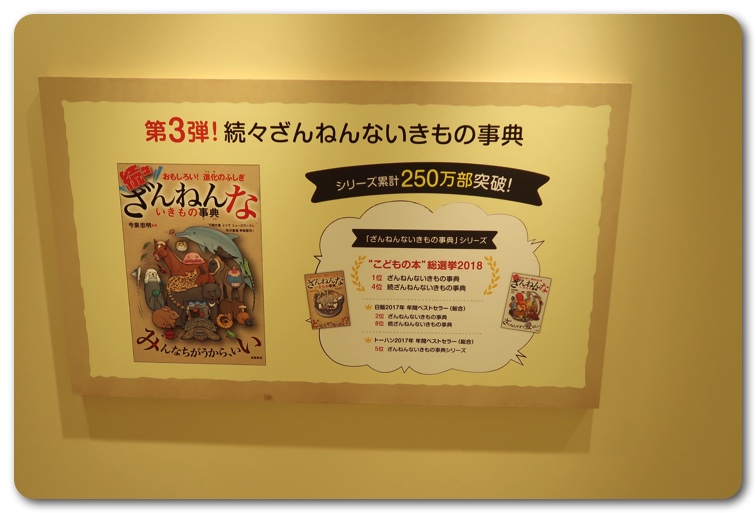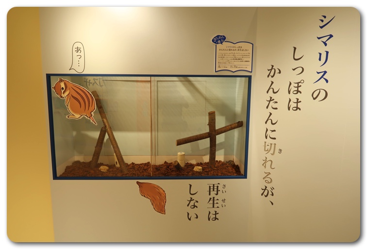 構成としては「ざんねんな体」「ざんねんな生き方」「ざんねんな能力」「ざんねんな名前」にわかりています。実際に生き物が展示されており、エピソードを読みながら実物を観察できます。