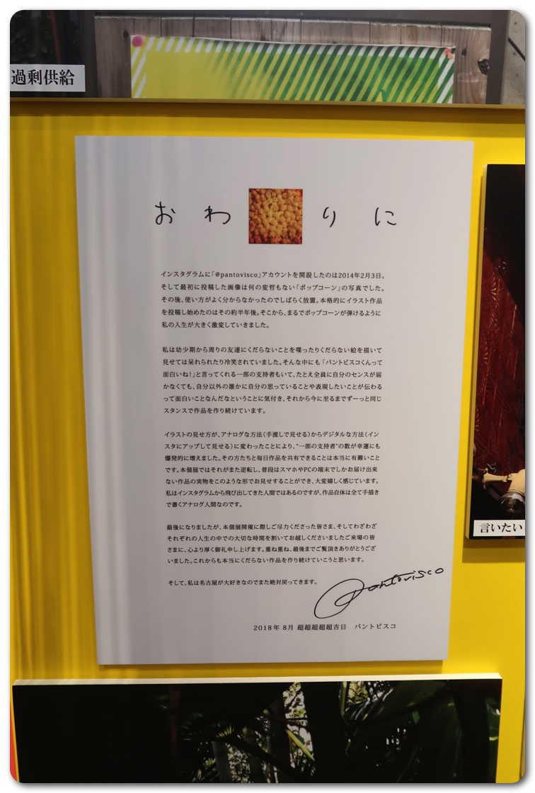 8月10日(金)に名古屋パルコで開催中の「ざんねんないきもの展」を訪れました。この時には全く気づかなかったのですが、後日、Facebookの友人が投稿しているのを見て初めて「パントビスコの個展」なるものの存在を知りました。なんと同じ名古屋パルコでイベントを開催しているとのこと。人間、アンテナが立っていないとすぐ横にポスターやパンフレットが置いてあっても全く認知されないということがよくわかりました。