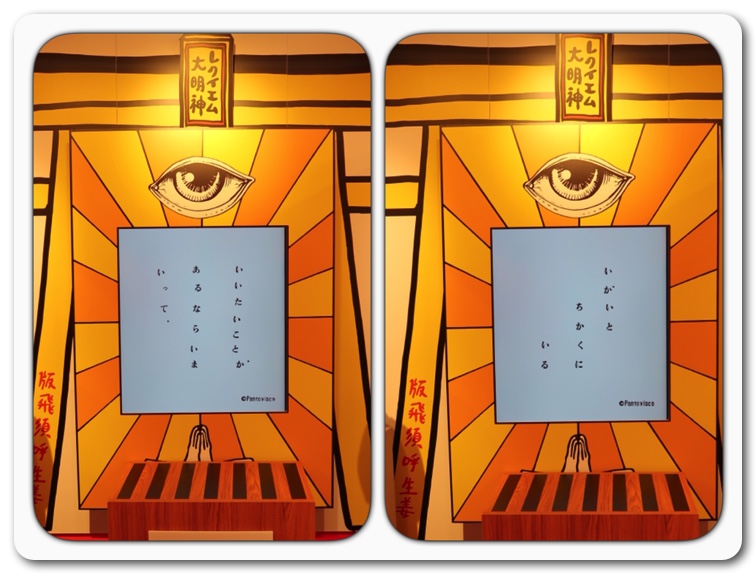 女性に大人気のコンテンツ「乙女に捧げるレクイエム」を用いた「レクイエム大明神」。高速で色々表示されており、写真を撮るとその都度違った文言が撮れる仕組みになっています。
