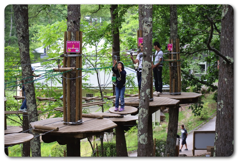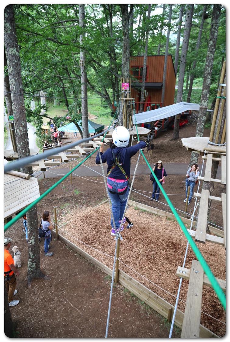 レクチャーの後は、順番にコースへ。キャノピーコースには2種類のコースがあり、比較的簡単なコースとやや難易度の高いコースに別れています。高さはゆうに5m以上あり、下を見ると足がすくみます。高所恐怖症ではありせんがおしりがこそばくなります。ただし、コンティニュービレイシステムで絶対に落ちることはないので、安心して楽しめます。
