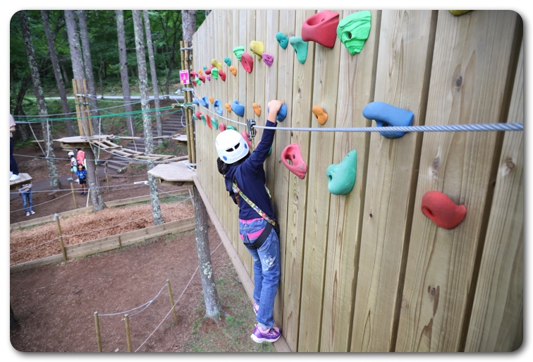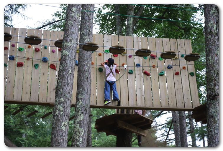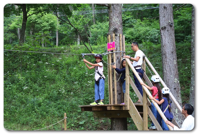 コースの最後は50mほどのジップラインがあり、これが気分爽快。アドベンチャーコースは倍以上の長さがありますので、もっと気持ちいいと思います。着地地点にはウッドチップが撒いてあり天然のクッションになっているので安心して楽しめます。小学3年生以下はヘルメット着用が義務づけられていますがそれ以上の年齢は被る必要はありません。