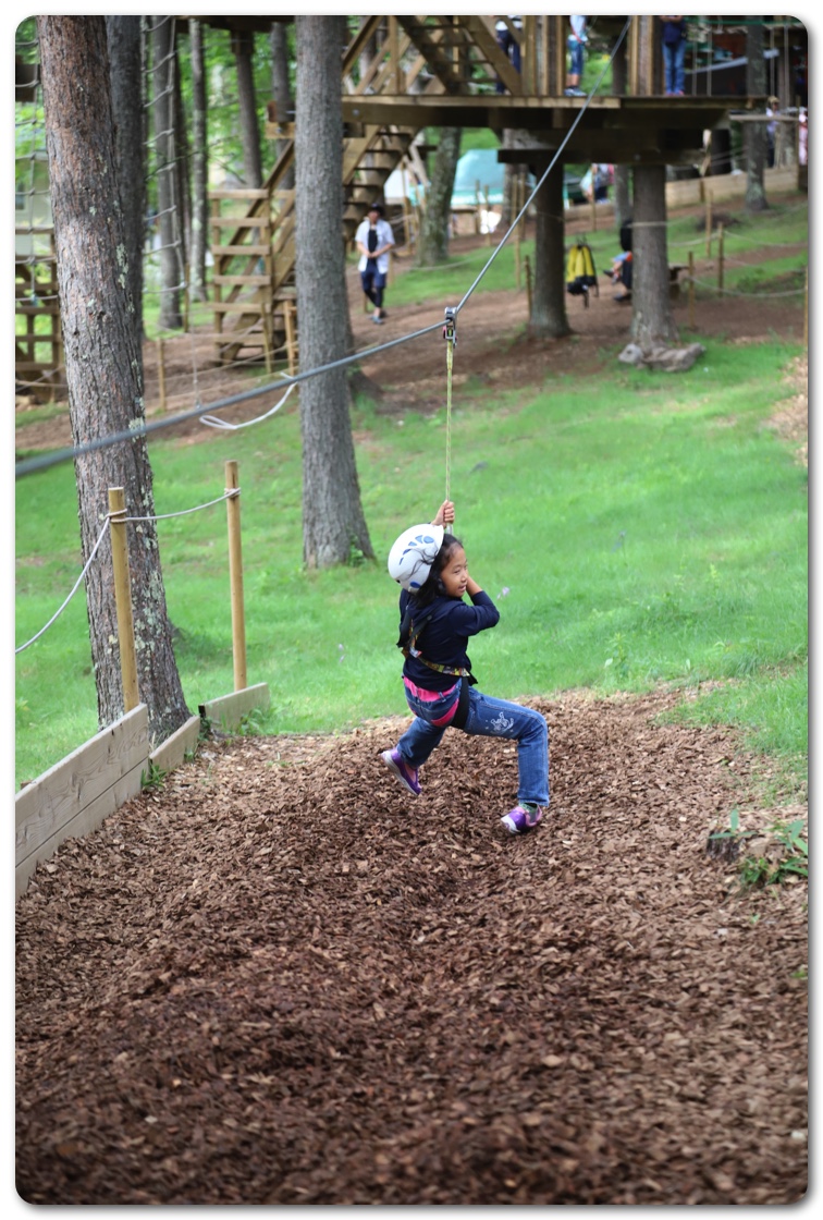 コースの最後は50mほどのジップラインがあり、これが気分爽快。アドベンチャーコースは倍以上の長さがありますので、もっと気持ちいいと思います。着地地点にはウッドチップが撒いてあり天然のクッションになっているので安心して楽しめます。小学3年生以下はヘルメット着用が義務づけられていますがそれ以上の年齢は被る必要はありません。
