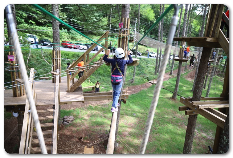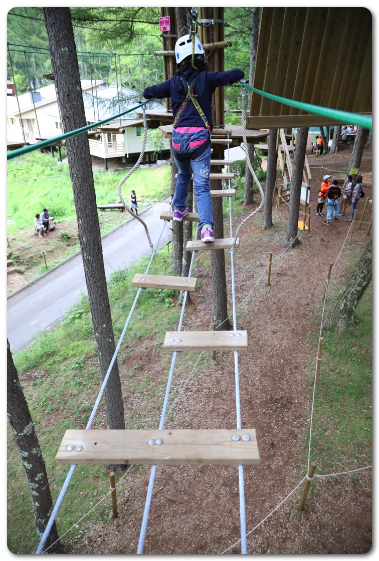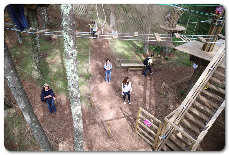 レクチャーの後は、順番にコースへ。キャノピーコースには2種類のコースがあり、比較的簡単なコースとやや難易度の高いコースに別れています。高さはゆうに5m以上あり、下を見ると足がすくみます。高所恐怖症ではありせんがおしりがこそばくなります。ただし、コンティニュービレイシステムで絶対に落ちることはないので、安心して楽しめます。