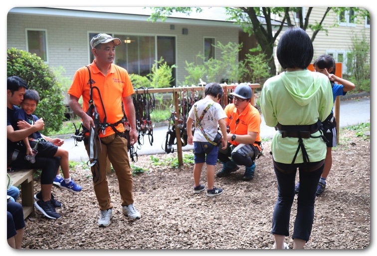 まずはハーネスを装着し、コンティニュービレイの使い方やジップラインでの滑り方などを約10分ほどレクチャーしてもらいます。
